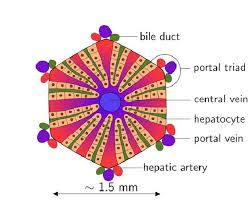 - Lobes are divided into functional units called lobules (1000 of them) – which contain hepatocytes (liver cells), bile ducts, and branches of the hepatic artery (carrying oxygenated blood), hepatic portal vein (carrying nutrient-rich blood) and hepatic vein – which are the functional units where blood is processed and bile is produced.